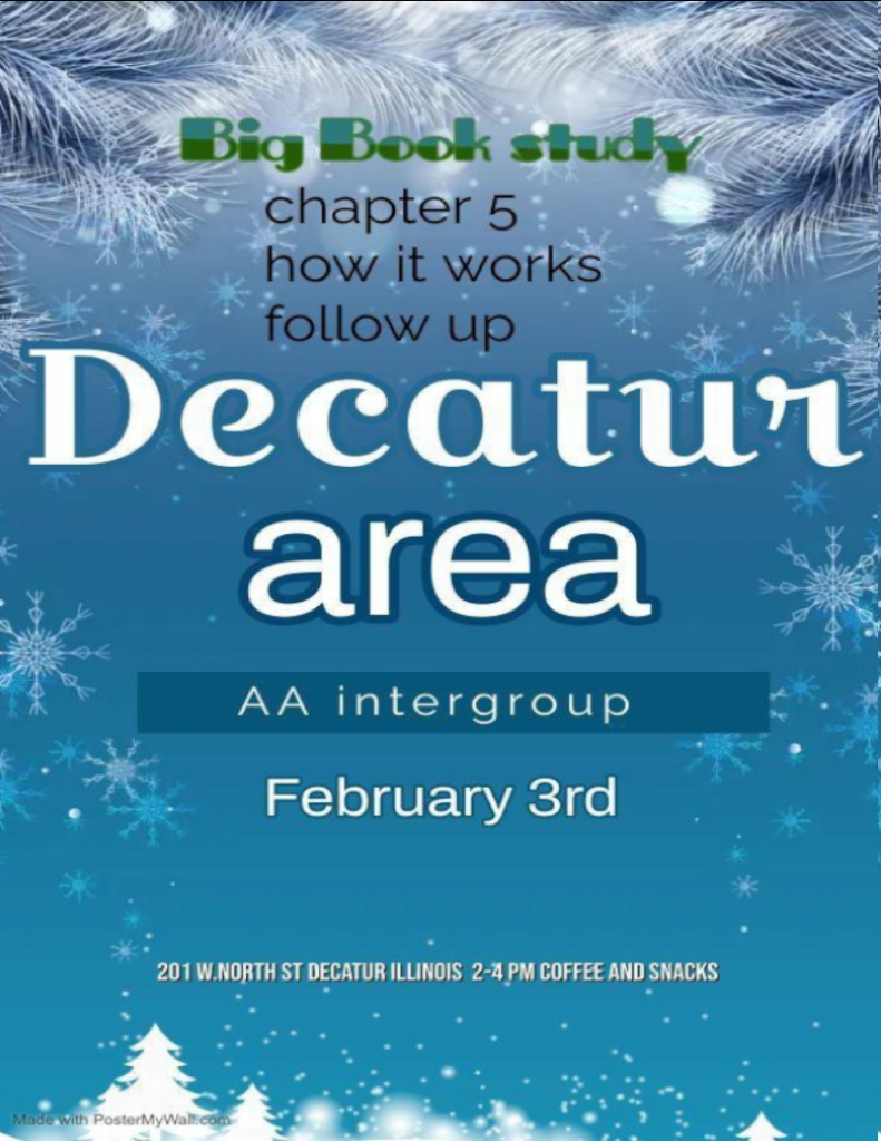 Decatur inter-group continues it’s Big Book Panel series. How it works follow-up. This will be an ongoing series on the first Sunday of every month.