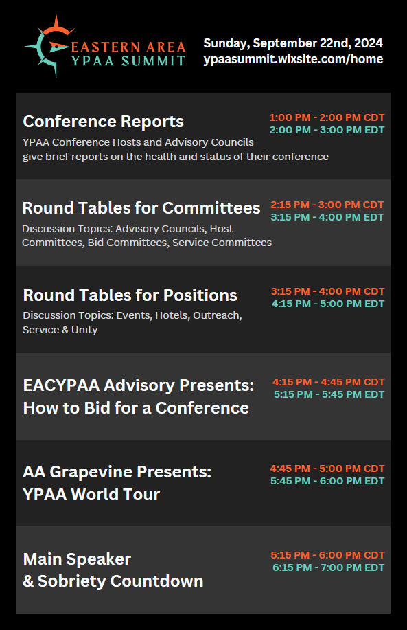 The Fall 2024 Summit will be held on Sunday, September 22nd, from 2:00 PM to 7:00 PM EDT (1:00 PM to 6:00 PM CDT) and is open to anyone who is interested in learning more about recovery, unity, and service and how we can better carry the message of AA through young people’s conference and committees.